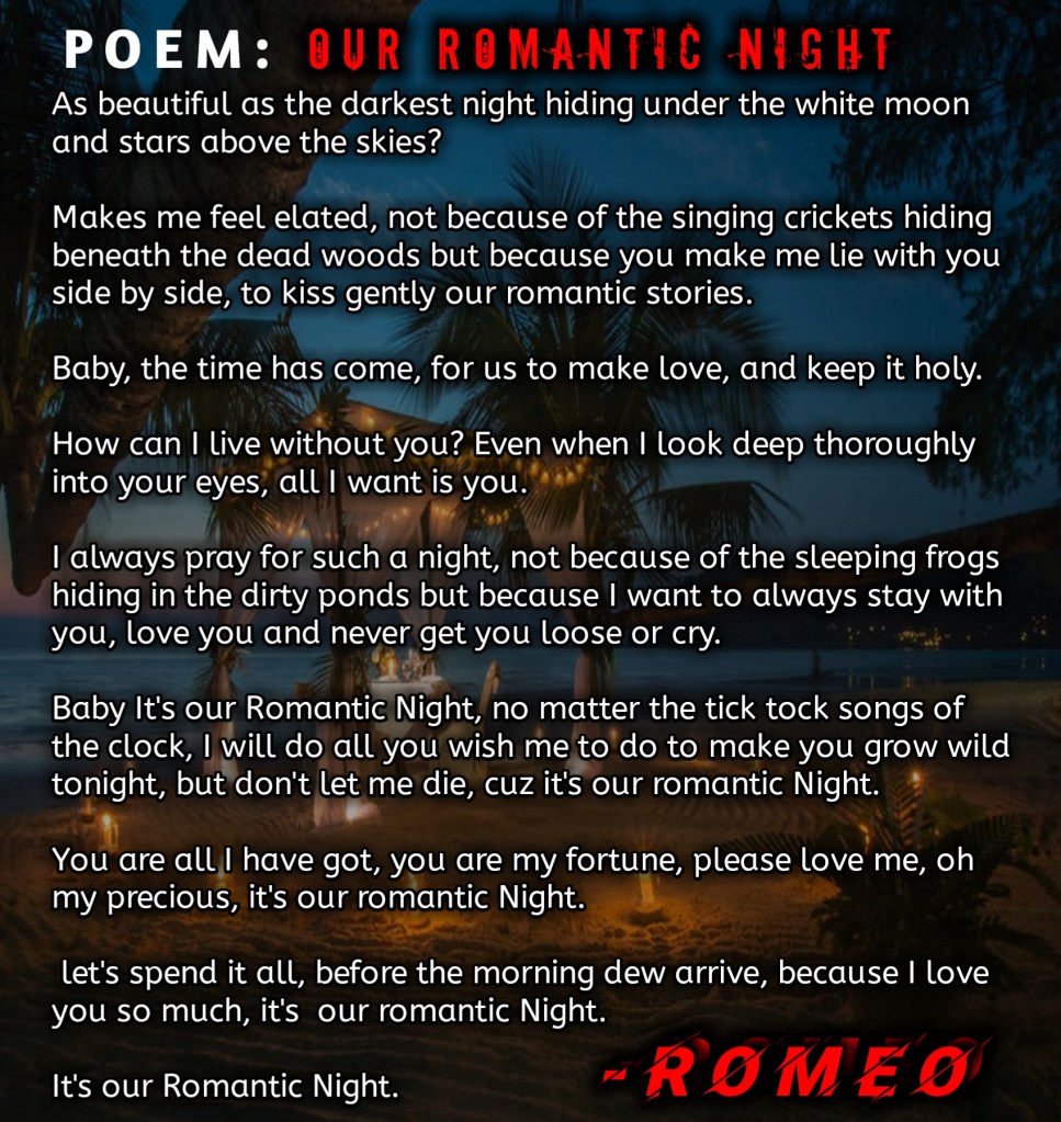hello trendian, This is my new latest poem tonight, I wrote this Poem because it will help your Boyfriend/girlfriend or wife to love you more. Not only that, this poem will also help save your relationship from tresspass especially when you want to spend your vacation or in holiday night with her.